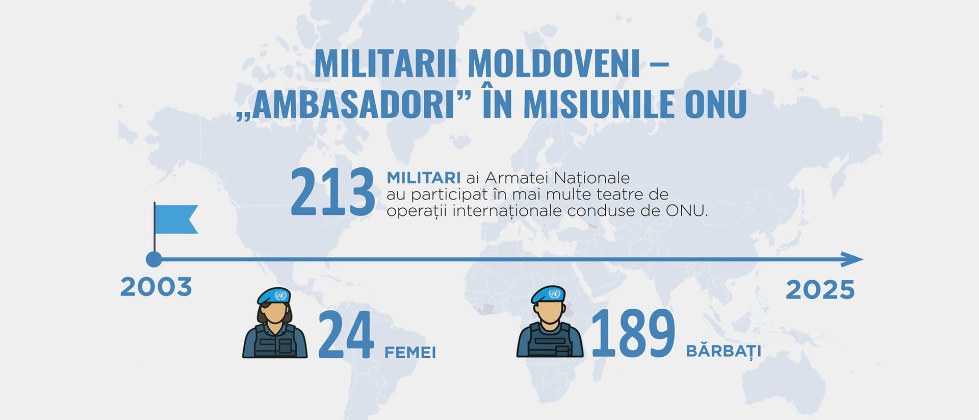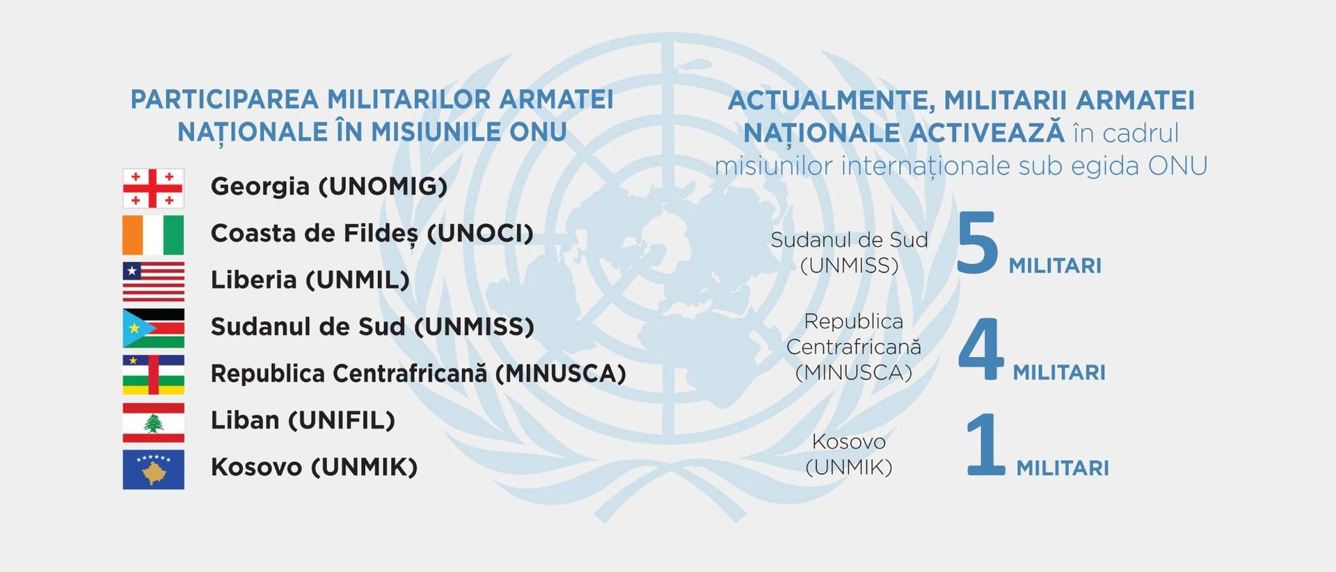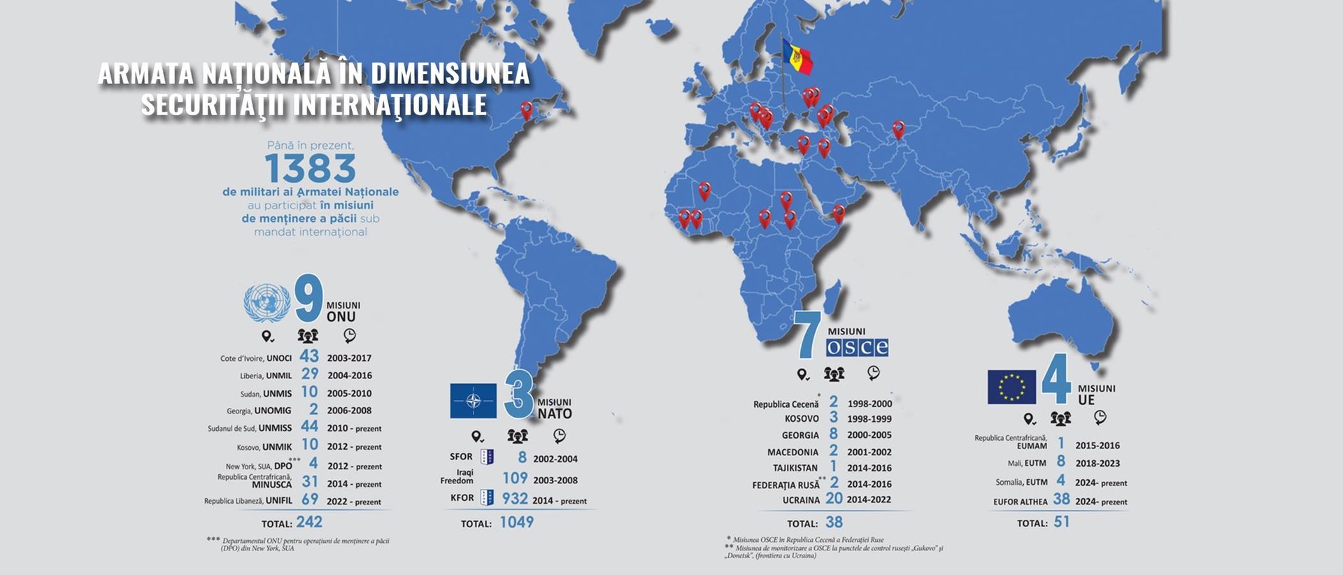 Militarii moldoveni contribuie la misiunile internaționale de menținere a păcii sub egida ONU, UE, NATO și OSCE. Prin aceste misiuni, Armata Națională demonstrează profesionalism, disciplină și angajament față de stabilitatea internațională.